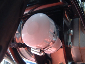 To replace the filter, slacken and remove the large jubilee clip. Place an oil drip tray below the filter and unscrew the filter counter clockwise either by the use of the strap wrench or piercing the thin metal filter casing with a sharp implement such as a strong screwdriver and turning to slacken. The filter will be badly damaged this way, but it is not intended to be re-used. Ensure that the old rubber sealing ring has come away with the cartridge, if not, remove it now. Lightly moisten the sealing ring of the new oil filter with oil and place into position, tighten the new filter into place with a strap wrench. Re-fit and tighten the screw clip around the filter and the retaining strip.